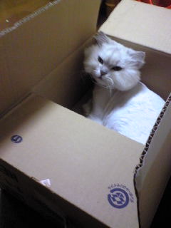 画像はベビー用品が届いた段ボール箱でもって昼寝する美景♪