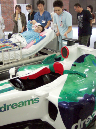 おそらくエンジンなどは搭載してないだろうけども、F1カーを病院内へという発想と