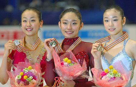 金メダルを手にする安藤美姫(中央)、左は2位の浅田真央、右は3位の金妍児(韓国)。日本女子の世界選手権優勝は3大会ぶり史上4人目。1大会で同時に2人がメダルを獲得したのは初めて(24日、東京体育館)(時事通信)